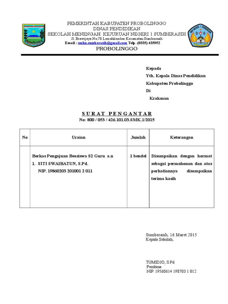 Berdasarkan kegiatan rutin cv berkah febri setiap tahunnya, yaitu evaluasi. Untuk format surat pengantar ini ada yang membuat seperti surat dinas biasa dan ada juga yang dibuat dengan memberikan kolom. Banyak contoh bagaimana pembuatannya surat yang baik sehingga tujuan dan maksud yang diinginkan akan tersampaikan. Berikut adalah contoh surat dinas lainnya seperti surat dinas laporan, surat dinas permohonan, surat dinas undangan dan surat dinas perintah dalam versi pdf Please fill this form, we will try to respond as soon as possible.