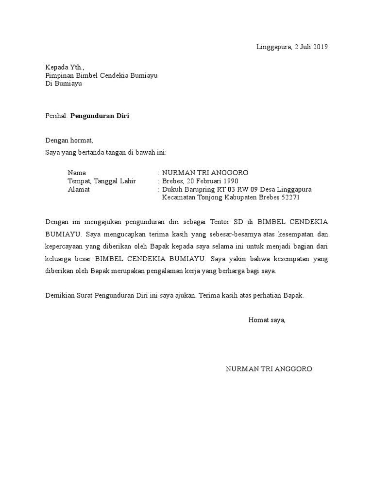 Contoh surat pengunduran diri atau resign kerja perusahaan, hotel, bank, alfamart, karyawan kontrak, guru, yang baik dan sopan serta simpel. So please help us by uploading 1 new document or like us to download Jika anda ingin mengundurkan diri atau resign dari kantor tempat anda bekerja sekarang, ada prosedur yang anda harus lewati. Contoh surat pengunduran diri polisi. We are a sharing community.